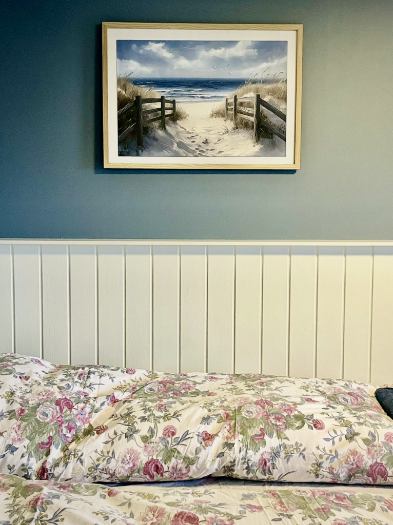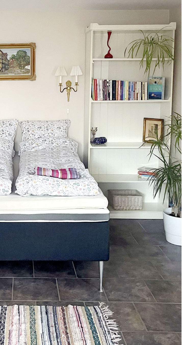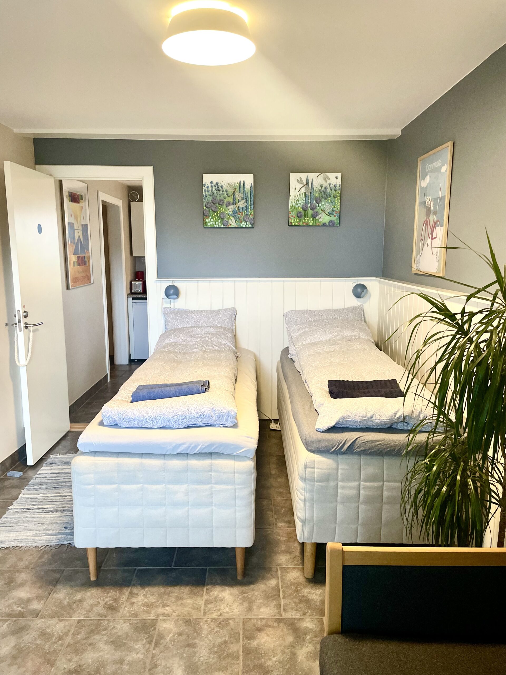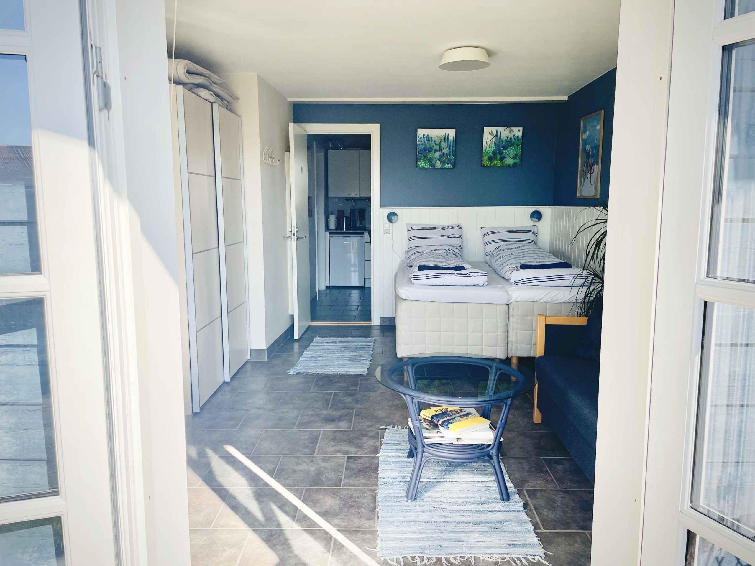 Ovenfor ses billeder af det blå værelse. Direkte adgang via havedør til privat gårdhave med fjordkig. Sovesofa med mulighed for 2 ekstra opredninger. Delt bad og køkken.
