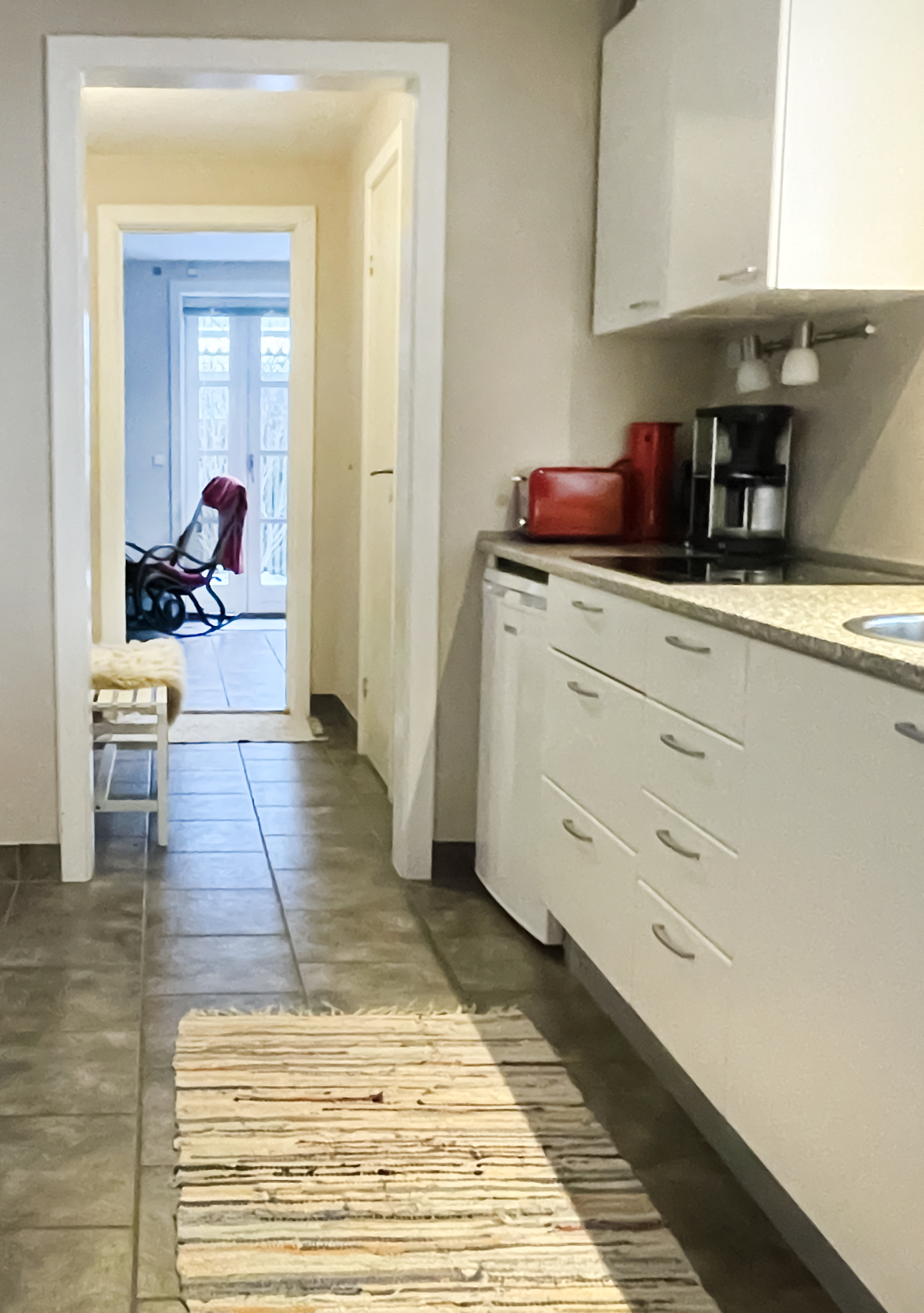 Det røde værelse vender ud mod forhaven øst/nord med aftensol på den private terrasse der hører til det røde værelse. mulighed for opsætning af weekendseng til enten ét barn eller én voksen. Delt bad og køkken..